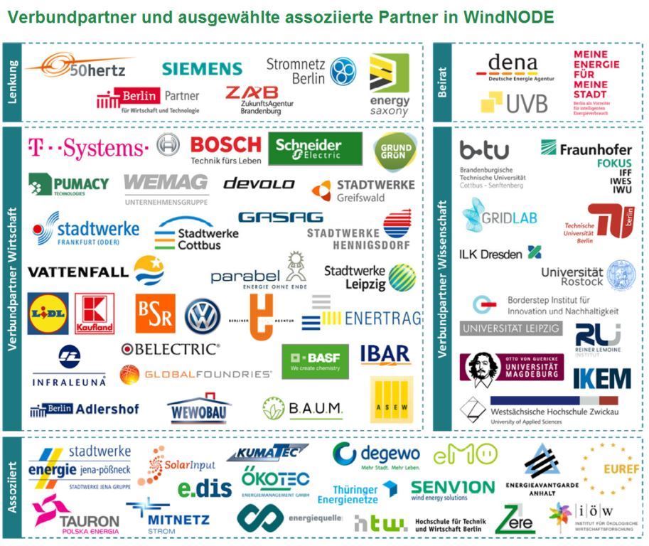 WindNODE wird von einem Konsortium aus 44 starken Technologie- und Industriepartnern sowie 16 weiteren assoziierten Partnern getragen. Zu den Mitgliedern des Konsortiums gehören innovative Unternehmen aus der Erneuerbaren-Branche, IT-Spezialisten, Energieerzeuger- und -verbraucher sowie Netzbetreiber und Forscher. Aus dem Lebensmittelhandel nimmt die Schwarz Gruppe (Lidl, Kaufland) teil. Projektpartner sind unter anderem der Übertagungsnetzbetreiber 50Hertz, der städtische Verteilnetzbetreiber Stromnetz Berlin, der Energieversorger und Flächennetzbetreiber WEMAG; die Technologiekonzerne Siemens, Bosch SI, T-Systems und Schneider Electric; die Erneuerbaren Energien-Spezialisten Belectric, Enertrag und Parabel; mehrere Stadtwerke, Quartiersbetreiber (z.B. EUREF), Unternehmen der Wohnungswirtschaft; Energieanwender in Schlüsselindustrien wie Automobil (Volkswagen), Chemie (InfraLeuna, BASF) und Halbleitern (Globalfoundries); die Einzelhandelsketten Lidl und Kaufland (Schwarz-Gruppe); hoch innovative kleine und mittlere Unternehmen wie Grundgrün, Pumacy und IBAR sowie die Initiative „Meine Energie für meine Stadt“. Die wissenschaftliche Begleitung übernehmen renommierte Universitäten und Forschungseinrichtungen. Auch der Austausch mit einschlägigen assoziierten Partnern auch über Ländergrenzen hinweg – unter anderem mit dem polnischen Verteilnetzbetreiber Tauron Dystrybucja S.A. – soll den europäischen Energiewendegedanken unterstreichen.